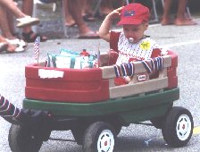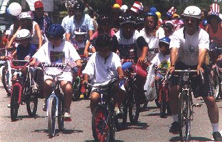 | The hour-long celebration features well-designed floats, parade units, marchers of all shapes and ages, clowns, and a sea of 1,200 bicycles ridden by kids who pick up their decoration kits the morning of the parade. Thousands bring their chairs up from the beach and line the town's streets. The day concludes with an evening concert at the bandstand and fireworks on the beach. |