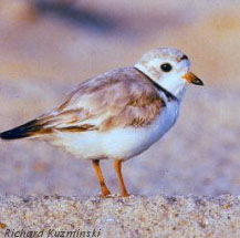 The adult has yellow-orange legs, a black band across the forehead from eye-to-eye, and a black ring around the base of its neck. Like other plovers, the Piping Plover runs in short starts and stops. When still, it blends into the open, sandy habitat of outer beaches where it feeds and nests. Piping Plovers Along the Atlantic CoastThe Piping Plover breeds on coastal beaches such as those found on the Delmarva Peninsula. The bird can be found from Newfoundland and southeastern Quebec to North Carolina to Florida. Some migrate to the Bahamas and West Indies. Common along the Atlantic coast in the 19th century, the birds nearly disappeared due to excessive hunting for the millinery trade. The Migratory Bird Treaty Act of 1918 helped the Piping Plover rebound in the 20th century to a peak in the 1940s but the population has declined again, apparently due to increased development and recreational use of beaches since World War II. The most recent surveys found about 1,000 pairs along the Atlantic. Find more info here: http://pipingplover.fws.gov/ Breeding and Feeding HabitsPiping Plovers return to their breeding grounds in late March or early April. After establishing a nesting territory and performing courtship rituals, the pairs form depressions in the sand somewhere on the high beach close to the dunes for nests that are sometimes filled with small stones or fragments of shell. The four eggs hatch in about 25 days and the downy young soon follow their parents for marine worms, crustaceans and insects they pluck from the sand. The eggs and the young are well camouflaged and will go undetected unless stepped on. When intruders come close, the young squat motionless on the sand while the parents attempt to attract the intruders' attention to themselves. They often do this by faking a broken wing. Surviving young fledge and fly in 30 days. Nests can be disrupted before the eggs hatch, though, by stormtides, predators or intruding humans. In those instances, plovers renest nearby and the birds hatched from those nests may not fly until late August. By mid-September, both adult and young plovers are on their way to their wintering areas. Threats to the Piping PloverSeveral factors contribute to the declining Piping Plover population along the Atlantic Coast, according to the Office of Endangered Species of the U.S. Fish and Wildlife Service: